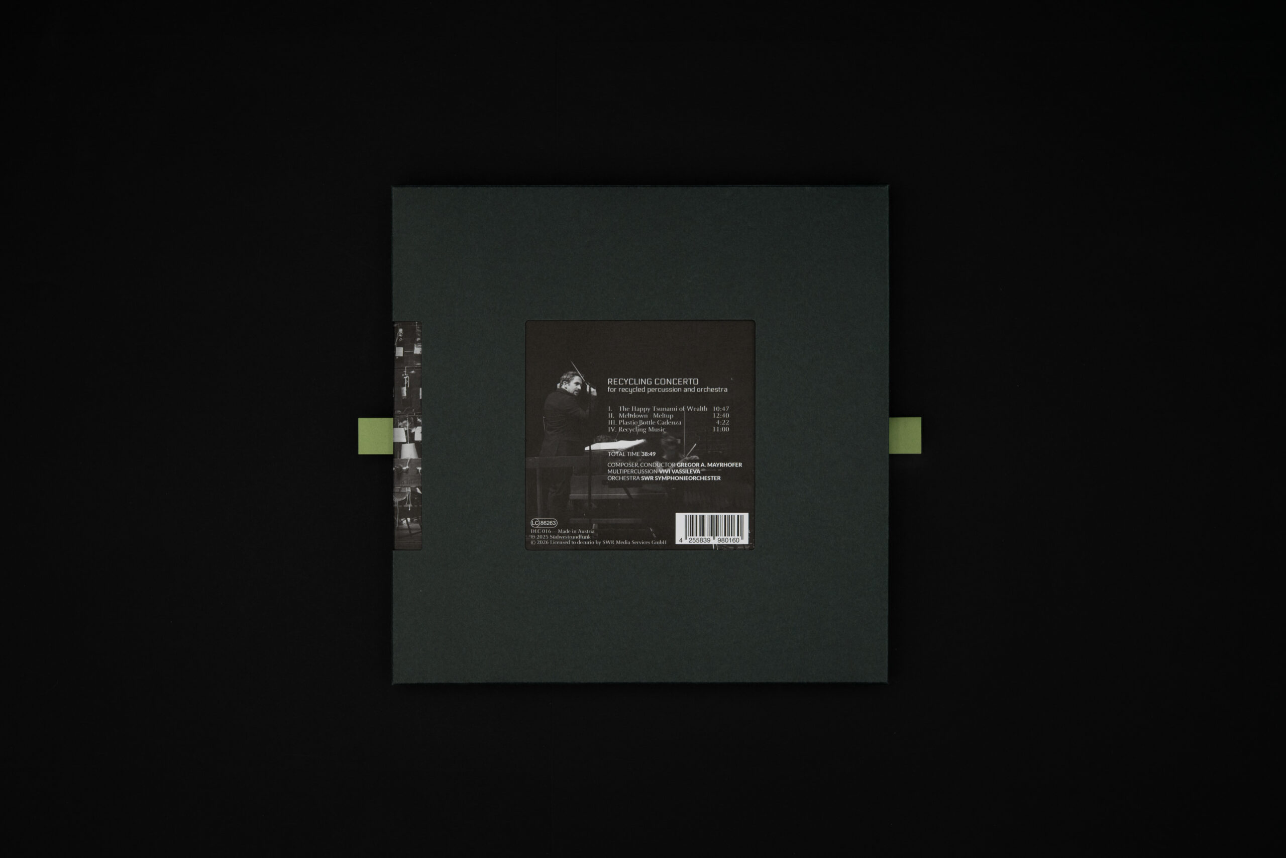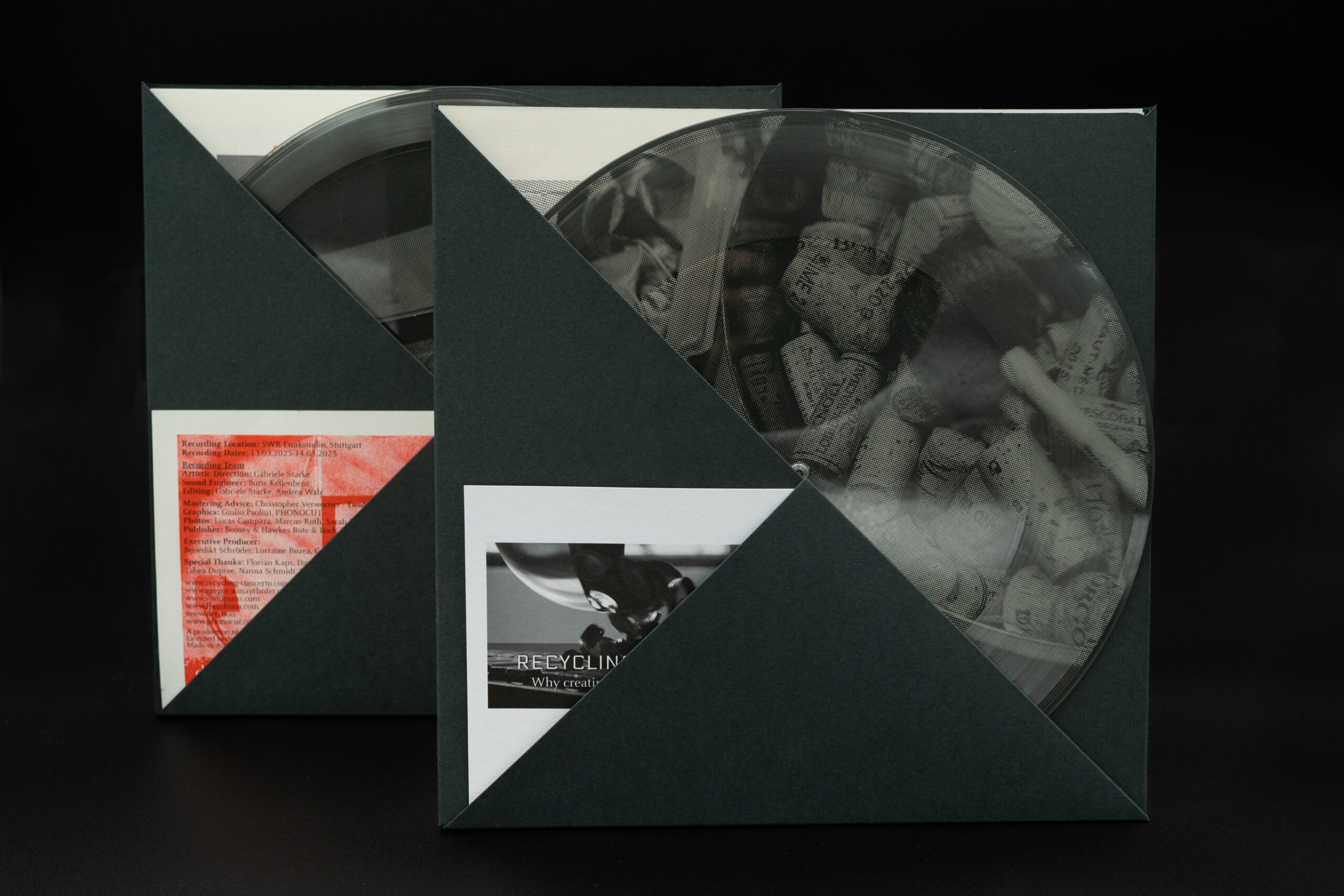 The recording with the SWR Symphonieorchester and Vivi Vassileva will be released on four vinyl records on March 30, 2026. This is the world’s first release of a symphony orchestra recording on vinyl made from recycled waste. Reflecting the central idea of the Recycling Concerto, sustainability is also the guiding principle in the production of the records: the vinyl is not only made from recycled ocean plastic, but produced exclusively on demand. Unlike industrially pressed records, these are cut directly into the material. Produced on machines from the Viennese workshop Phonocut, each record is made individually and becomes a handcrafted, unique object – analog, sustainable, and audiophile.